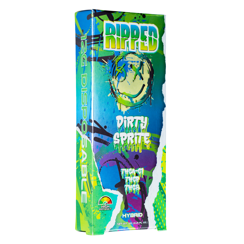 Try our new 12-gram Dirty Sprite Hybrid Ripped Blend disposable, crafted with THCA-C1, THCP, and THC8, infused with the unique terpenes of Dirty Sprite. This hybrid offers a cool burst of lemon-lime citrus and pine with earthy undertones, perfect for a balanced high that sharpens mental focus while easing the body. Ideal for enhancing social interactions or solo relaxation, our large-format disposable packs lasting utility in a sleek, vibrant package.